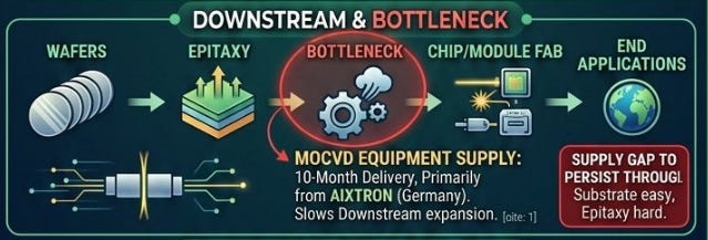 Tongmei’s substrate business sits upstream. But channel checks suggest that one of the real bottlenecks in the broader InP ecosystem is epitaxy — particularly MOCVD deposition at larger wafer sizes. That is a very different part of the value chain, and one where Aixtron remains the dominant equipment supplier with over 70% market share. Unlike VGF, there are few Chinese-equivalent tools for InP readily available; channel checks suggest Aixtron is now beginning to shift its supply chain from SiC/GaN tools to InP due to current backlog lead-time constraints.