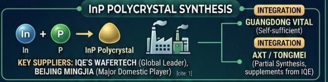 Polycrystalline synthesis involves combining liquid metal Indium with Phosphorus vapor to create a solid, high-purity polycrystalline ingot. While some players rely on third parties (including IQE), Tongmei is vertically integrated and can produce its own InP polycrystals.
