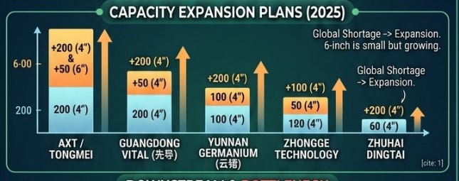 Capex for VGF expansion does not appear prohibitive. Not only has AXT highlighted a doubling of capacity this year, but domestic peers, including Yunnan Germanium (002428), are also rapidly expanding. If demand remains strong, capacity can come in faster than many investors expect, as we see no meaningful capacity constraints for domestic equipment.