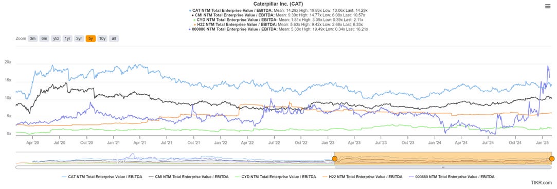 CYD’s closest domestic peer, Weichai Heavy Machinery (SHE:000880), has recently seen a significant share price increase, reflecting the market’s recent recognition of its future earnings potential. Global peers including Caterpillar and Cummins have also seen strong performance driven by their respective power solutions business segments and typically trade at more than 10x EBITDA.