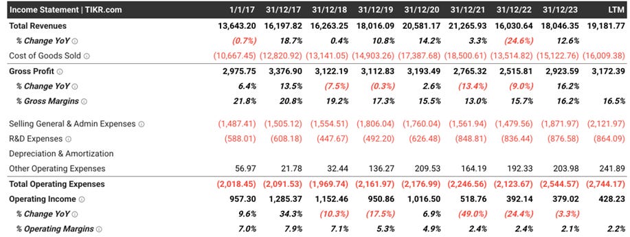Between 2013 and 2023, CYD’s on-road engine sales volumes dropped 65%. However, the company offset this decline by shifting its mix to higher-value, larger engines and increasing off-road engine sales. This resulted in stable revenues, with average sales prices doubling over the decade, albeit with some gross margin pressure, with gross margins declining from ~20% to ~16%. Positively, gross margins are inflecting.