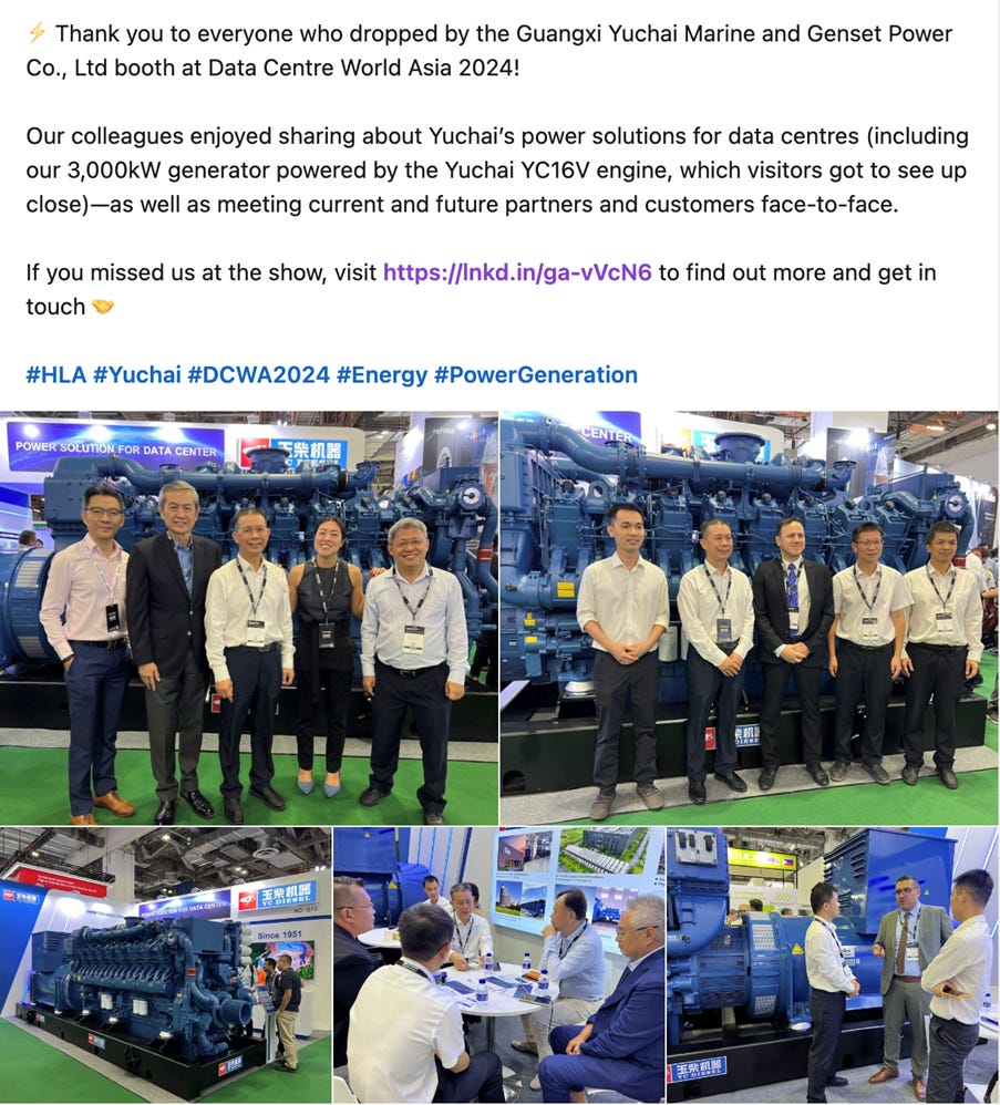 Revenue from Other Products and Services: This segment accounted for ~24% of revenues in 1H24, albeit only a small portion is directly related to data center applications through Yuchai’s YC16V and related product range, not only is the company expanding capacity through capex investment, Yuchai is also proactively marketing its product range at industry trade shows as shown in its recent Linkedin posts.