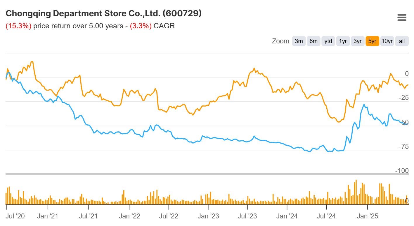 Chongqing Department Store: The key actor in the $2722.HK turnaround is Yufu, a financial shareholder. We can see a playbook for their involvement from their role in the turnaround of Chongqing Department Store since 2020. Despite a brutal environment for Chinese retail (where competitor Yonghui's stock halved and peers went bankrupt), Yufu successfully guided the company to stabilize operations, grow earnings and protect shareholder value, demonstrating its capability as a constructive, hands-on investor.