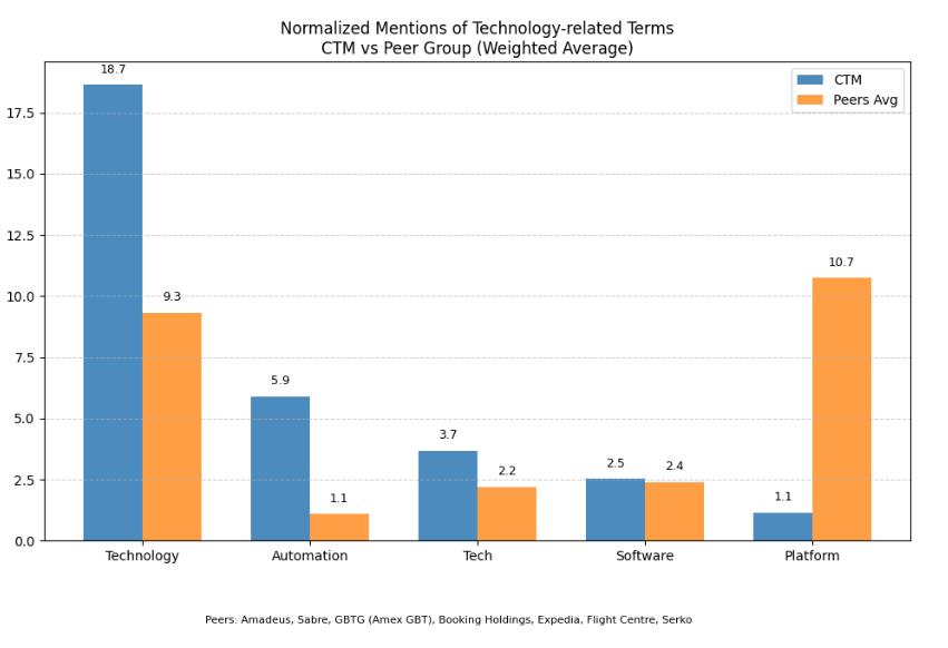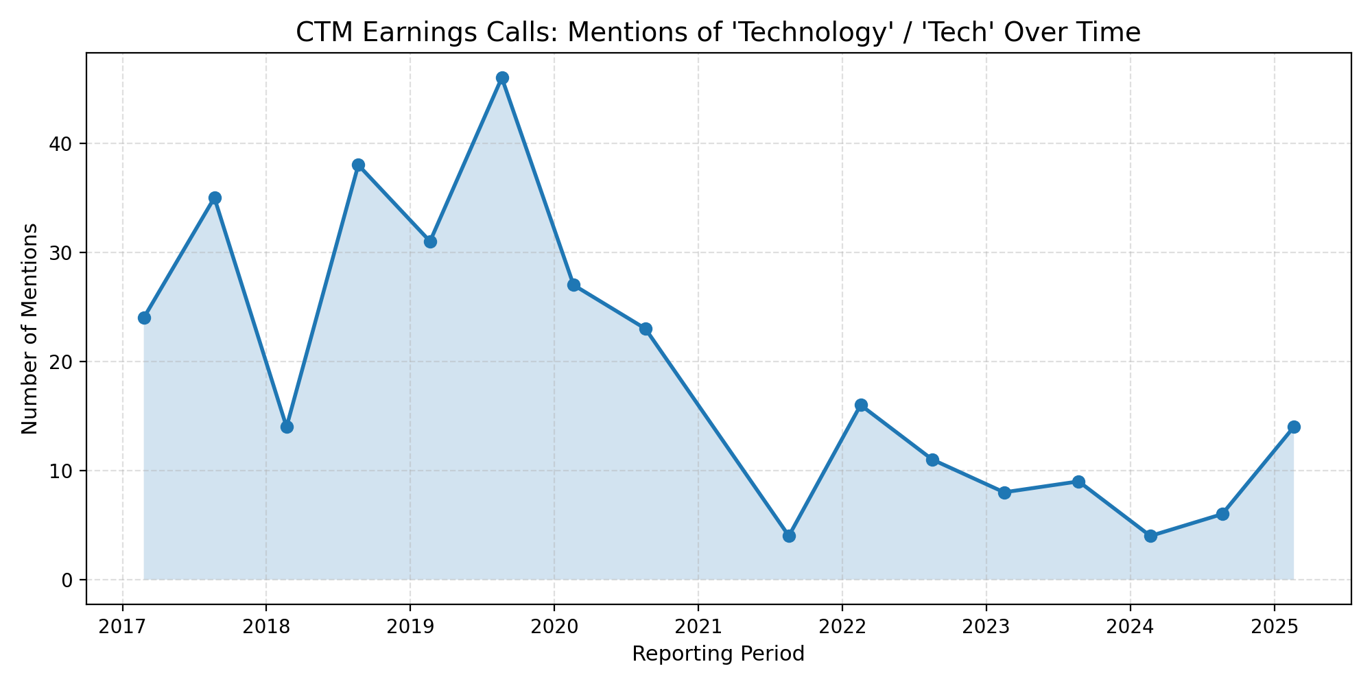 Our quantitative linguistic analysis of CTM’s earnings call transcripts shows that management’s emphasis on “technology” and “automation” was materially higher than that of industry peers and intensified during periods of margin scrutiny. By contrast, peer companies more frequently refer to “platforms,” reflecting sustained investment in multi-product technology architectures. This divergence in language is consistent with differences in business models rather than communication style alone.